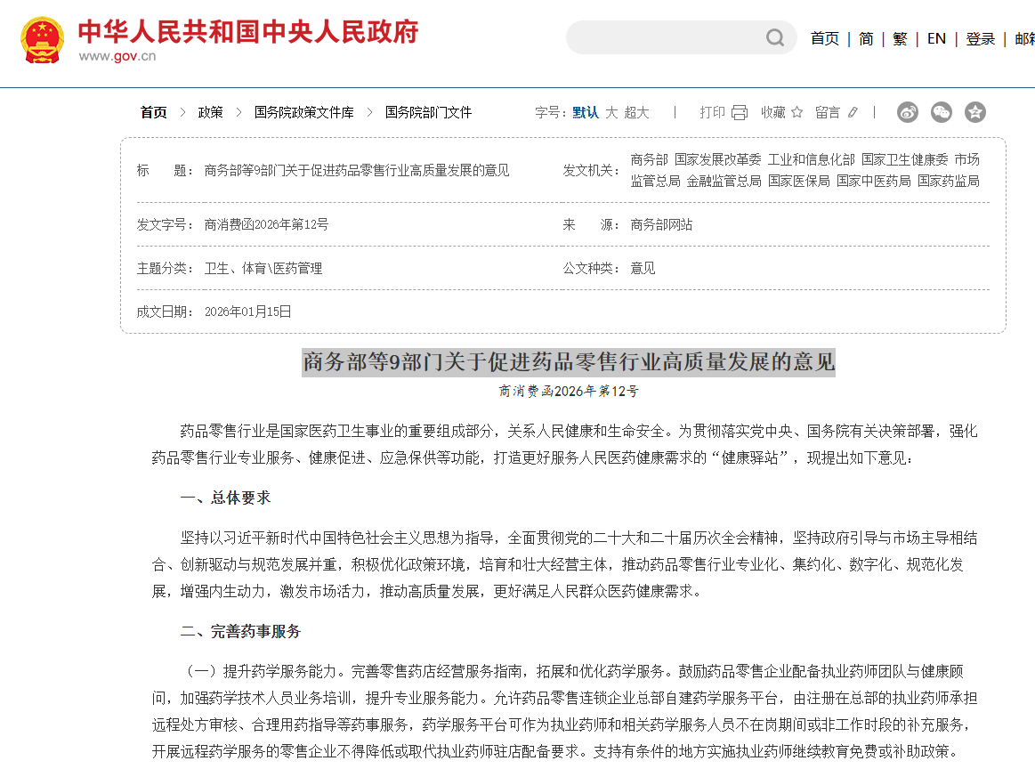 药品零售行业是国家医药卫生事业的重要组成部分,关系人民健康和生命安全。为贯彻落实党中央、国务院有关决策部署,强化药品零售行业专业服务、健康促进、应急保供等功能,打造更好服务人民医药健康需求的“健康驿站”