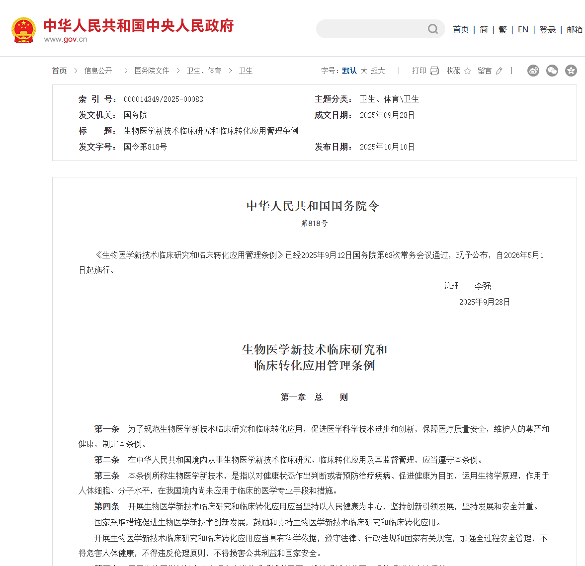 国务院总理李强日前签署国务院令,公布《生物医学新技术临床研究和临床转化应用管理条例》(以下简称《条例》),自2026年5月1日起施行。 《条例》旨在规范生物医学新技术临床研究和临床转化应用,促进医学科学技术进步和创新,保障医疗质量安全,维护人的尊严和健康。《条例》共7章58条,主要规定了以下内容。 一是明确总体要求。规定开展生物医学新技术临床研究和临床转化应用应当坚持以人民健康为中心,坚持创新引领发展,坚持发展和安全并重,鼓励和支持临床研究和临床转化应用,加强全过程安全管理。 二是规范临