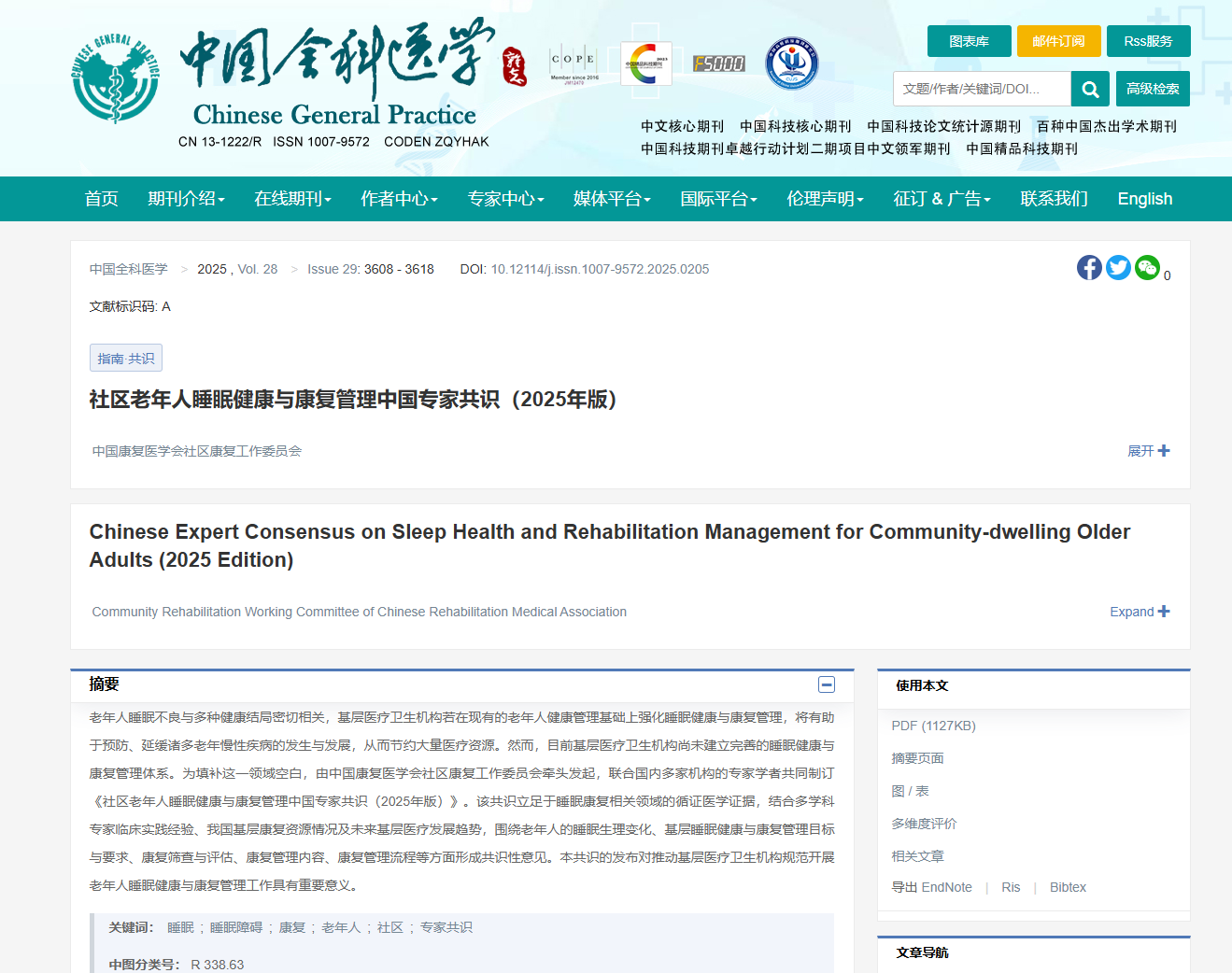 查看详情老年人睡眠不良与多种健康结局密切相关,基层医疗卫生机构若在现有的老年人健康管理基础上强化睡眠健康与康复管理,将有助于预防、延缓诸多老年慢性疾病的发生与发展,从而节约大量医疗资源。然而,目前基层医疗卫生机构尚未建立完善的睡眠健康与康复管理体系。为填补这一领域空白,由中国康复医学会社区康复工作委员会牵头发起,联合国内多家机构的专家学者共同制订《社区老年人睡眠健康与康复管理中国专家共识(2025年版)》。